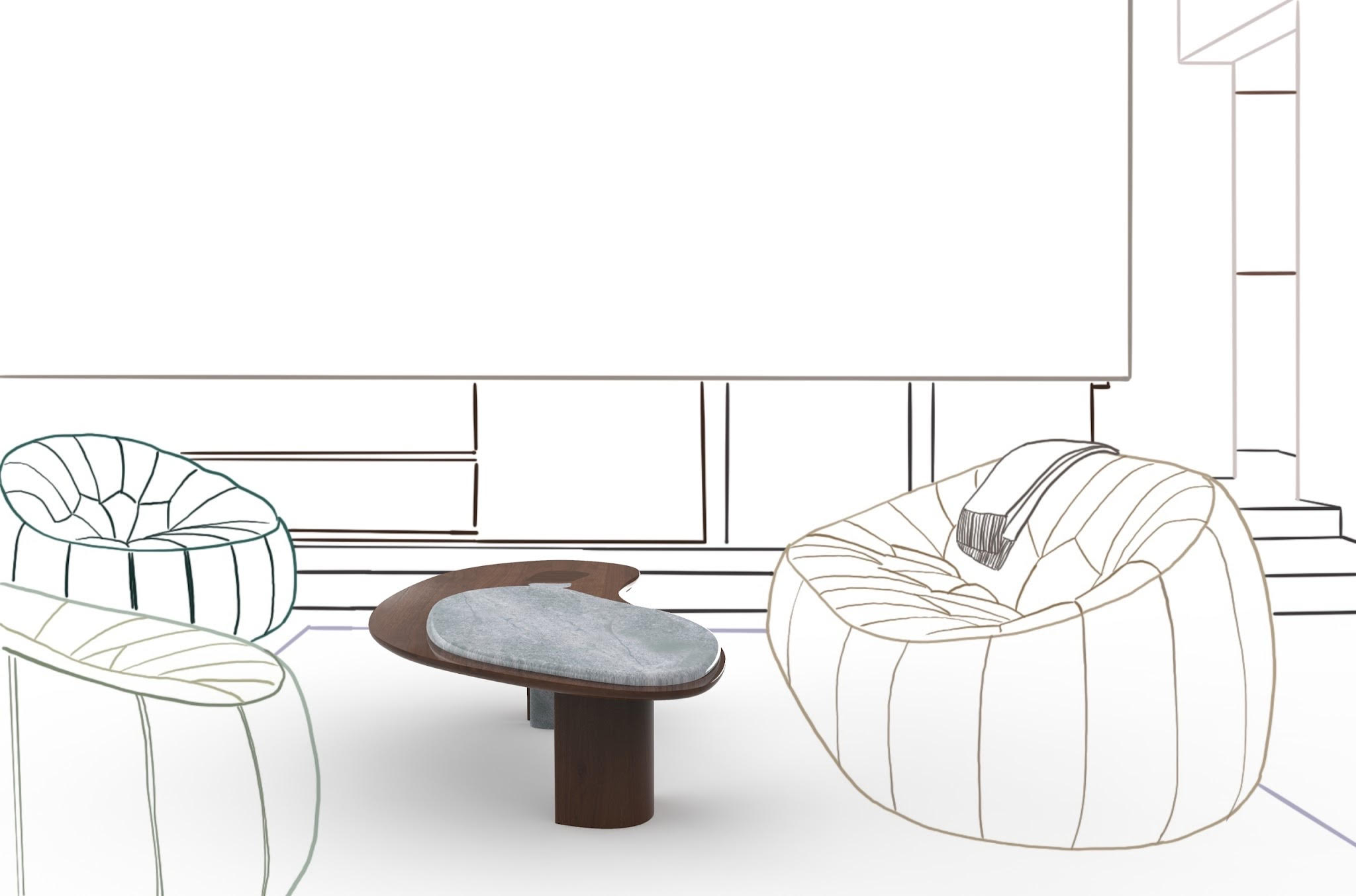 Durare est une table basse vecteur de convivialité située au cœur de l’habitat. Ses courbes chaleureuses sont évocatrices de savoir-faire et de modernité. Sa forme enveloppe les usagers afin de favoriser un contact propice à l’échange et au partage. Son esthétique fait dialoguer des matières contrastées, elle allie un bois sombre et imposant avec une pierre claire et finement taillée.