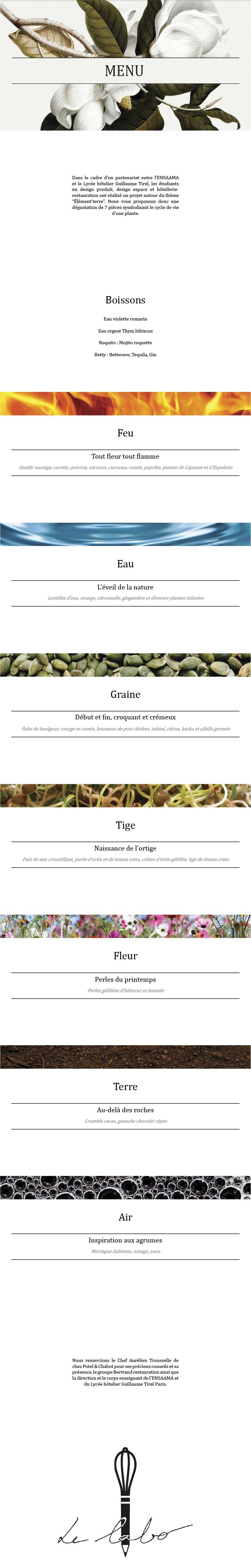 Un partenariat entre l'Ensaama et le Lycée G. Tirel. Détail du menu conçu par les étudiants du Lycée G. Tirel et de l'Ensaama.