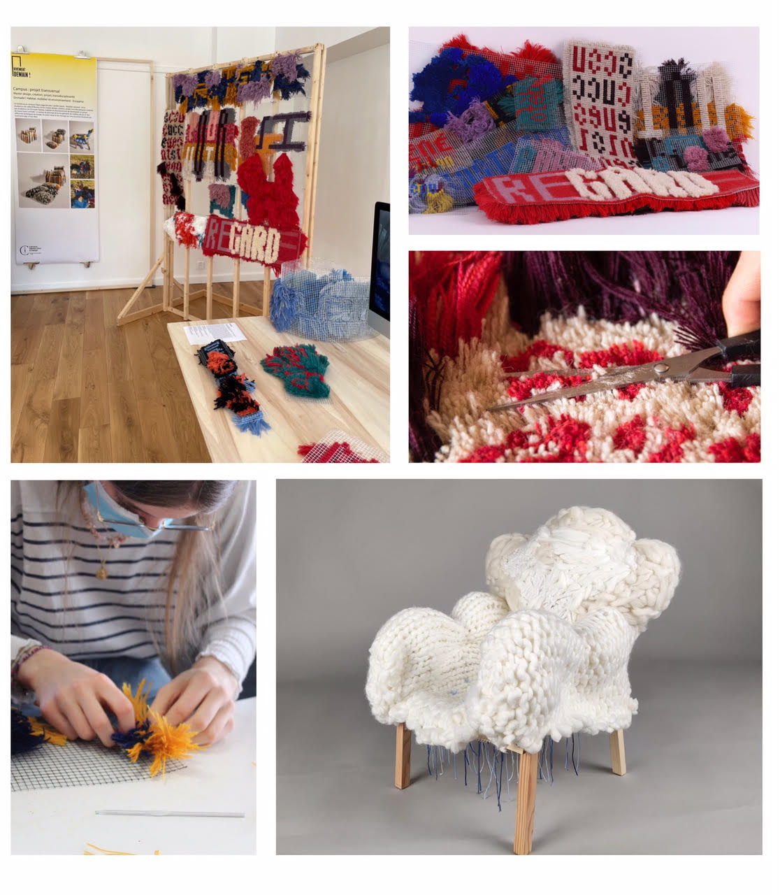 - Collectif BureauA4 / MurMur, typographie en point noué et double lecture + participation à un workshop transdisciplinaire avec les Dnmade1 Habitat, mobilier et environnement de l'Ensaama, chaises textiles en tissage, point noué et tressage.