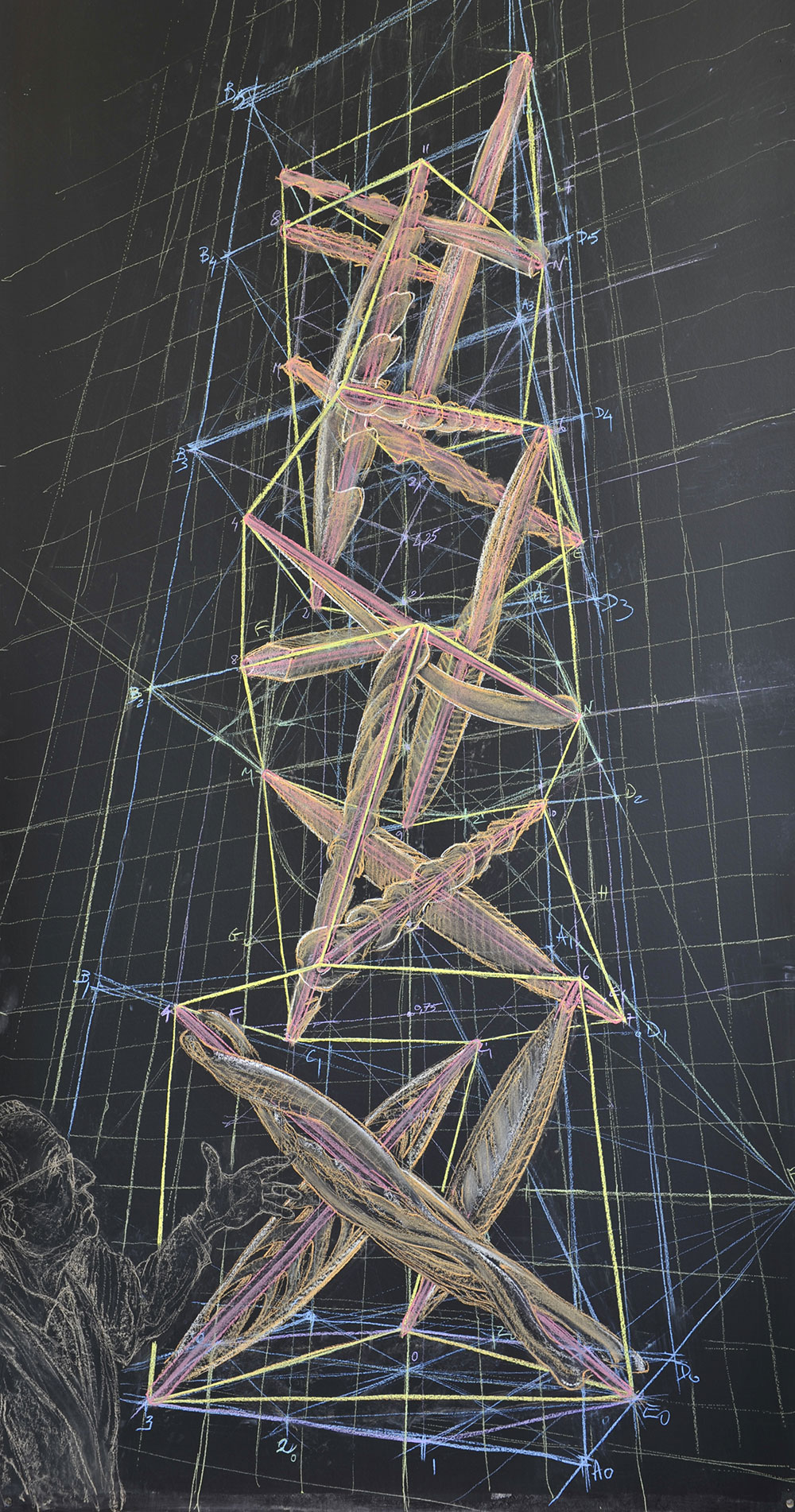 Fondé sur l’analogie entre la statique des vertébrés -des os travaillant en compression, maintenus par la tension des muscles – et l’architecture métallique de l’ère industrielle, ce système a pour caractéristique principale de séparer complètement câbles et étais, en un réseau isostatique d’une grande élégance.