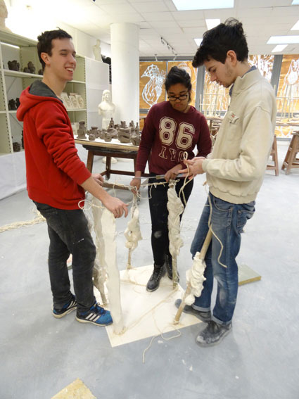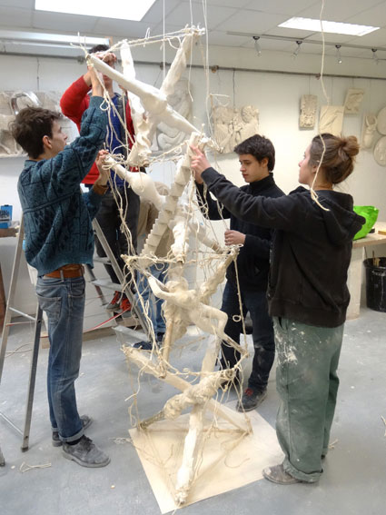 Tenir lieu de proposition sculpturale réunissant le plus possible de nos spécialités volume, afin de tenir lieu de 1% artistique au sein de notre école rénovée mais qui n’en possède pas... et convaincre la Région d’en financer la réalisation à 9 mètres.