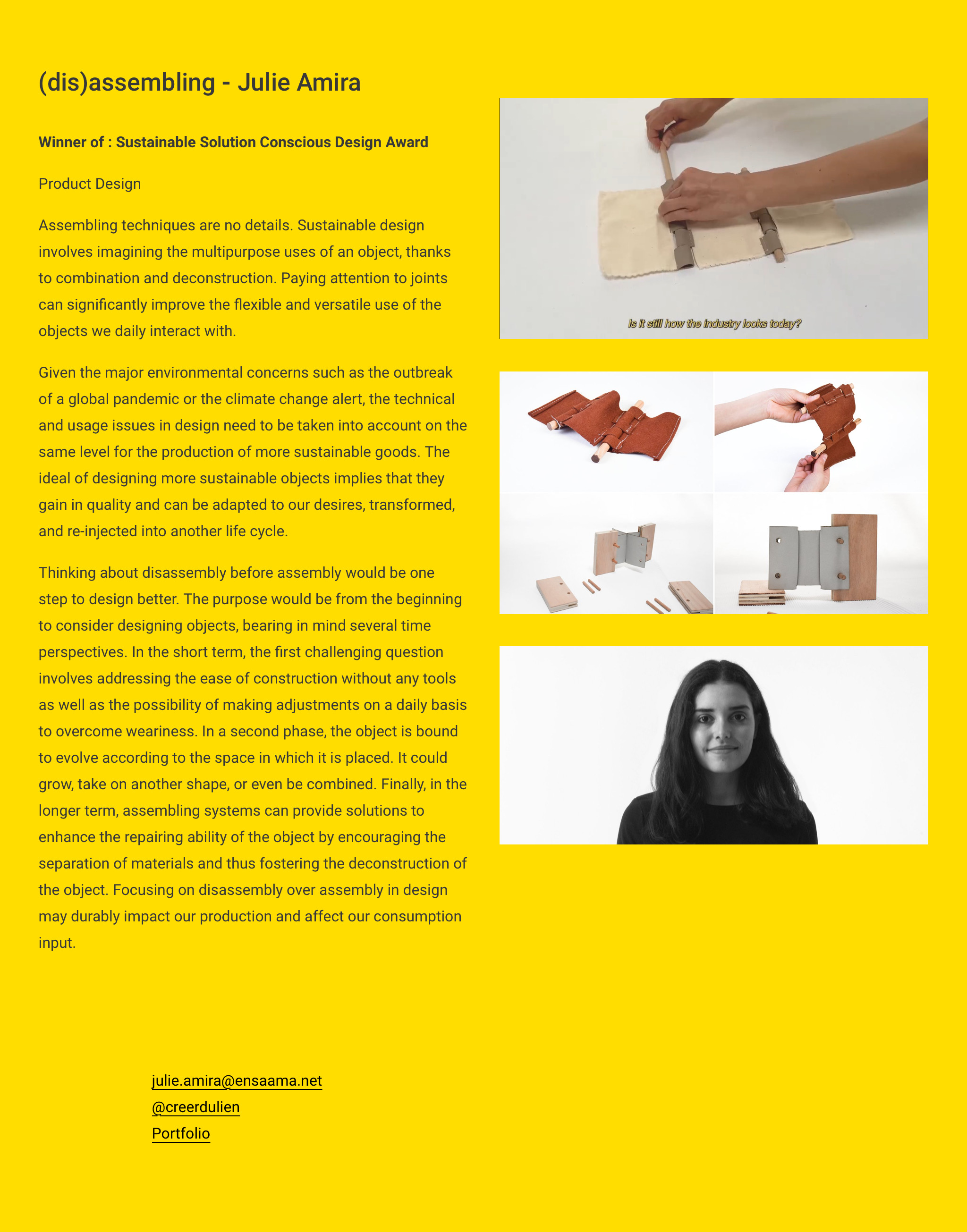 - Julie Amira, DSAA design produit, promotion 2021, récompensée par un Prix spécial mention "sustainable solution" pour son projet (Dis)Assembling.