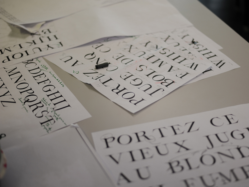 Fondé sur un objectif d’interprétation à partir d’une source visuelle du 17e siècle, les étudiants devaient concevoir et dessiner, en équipe, une police de caractère.