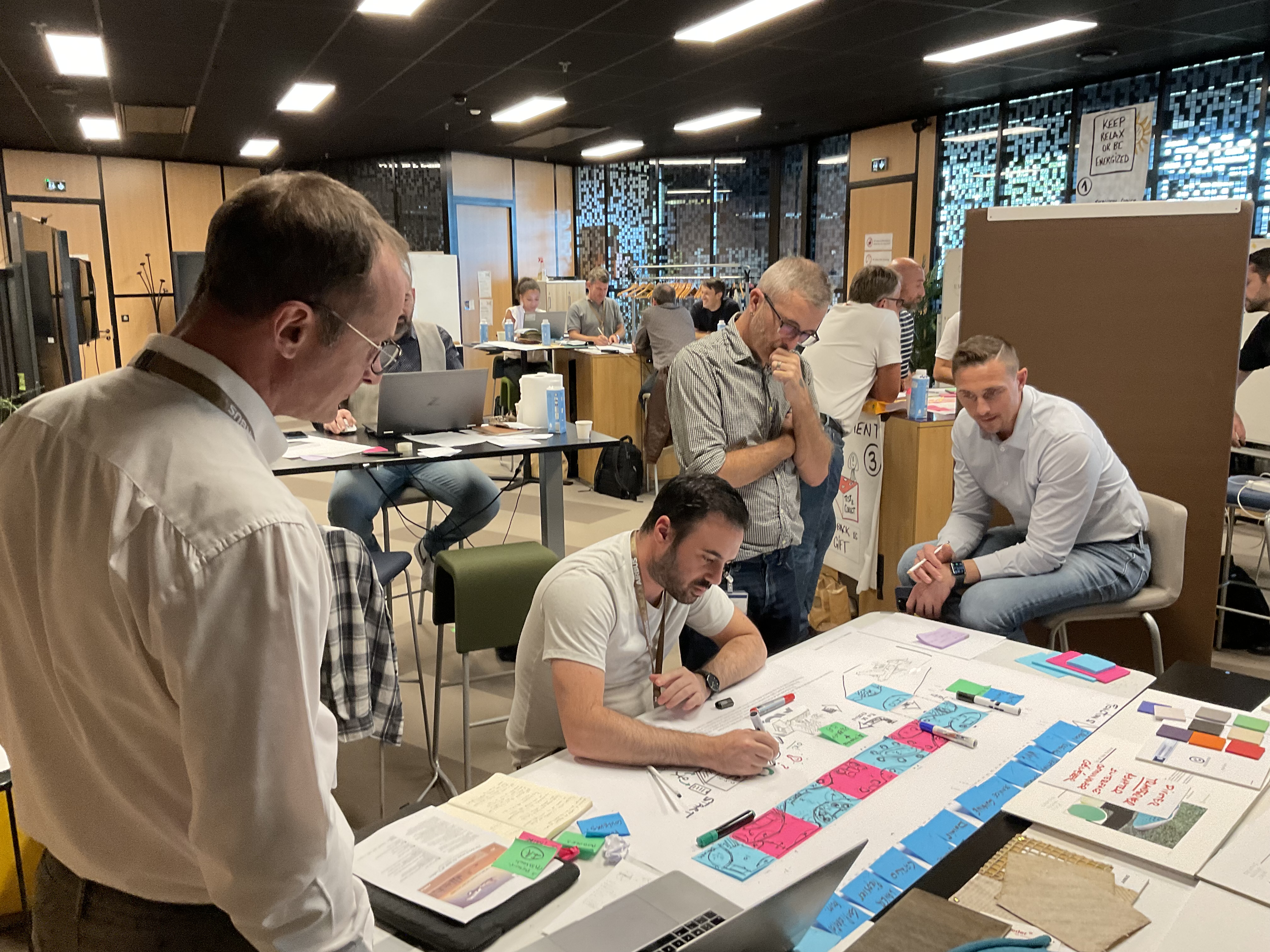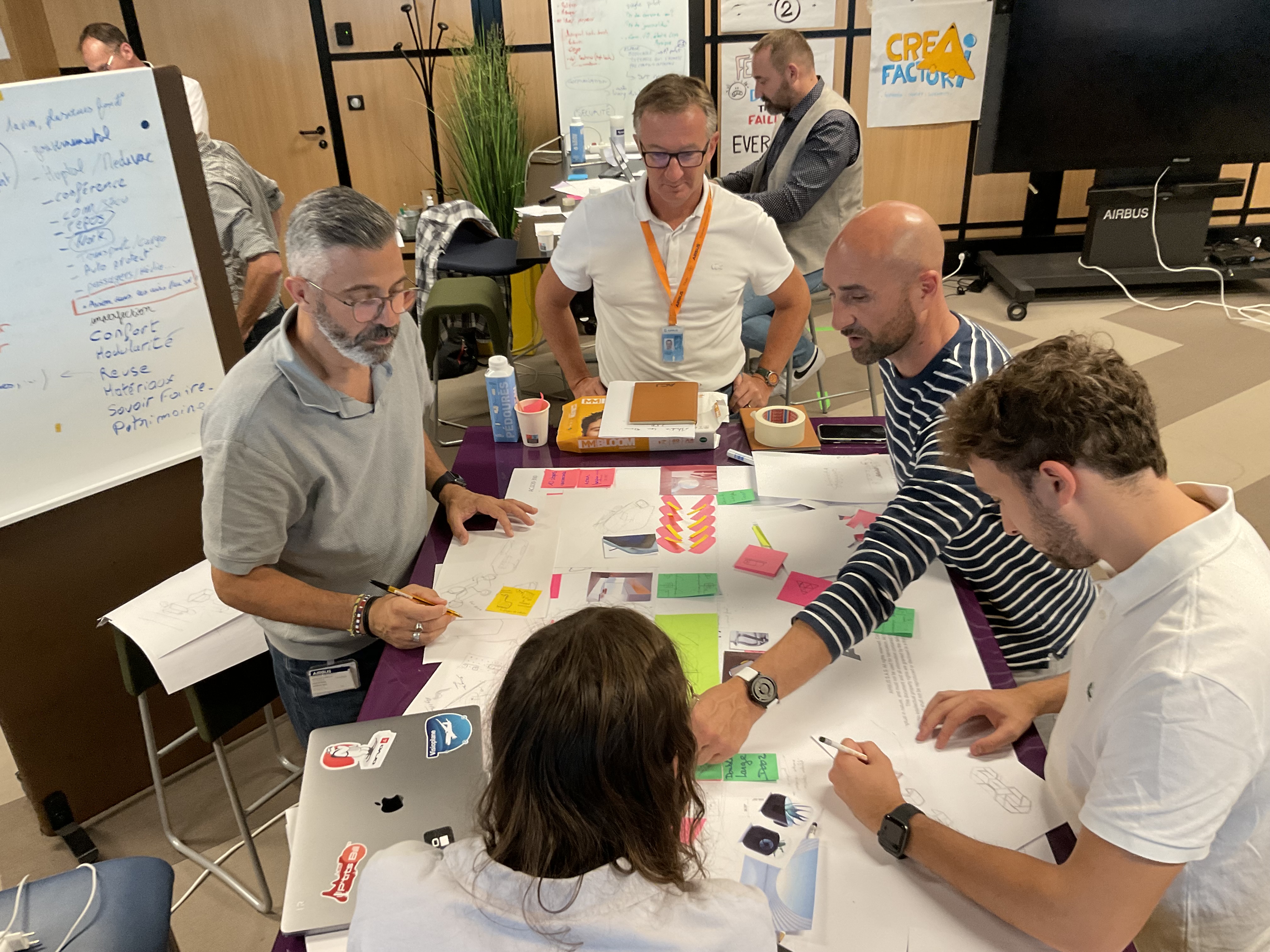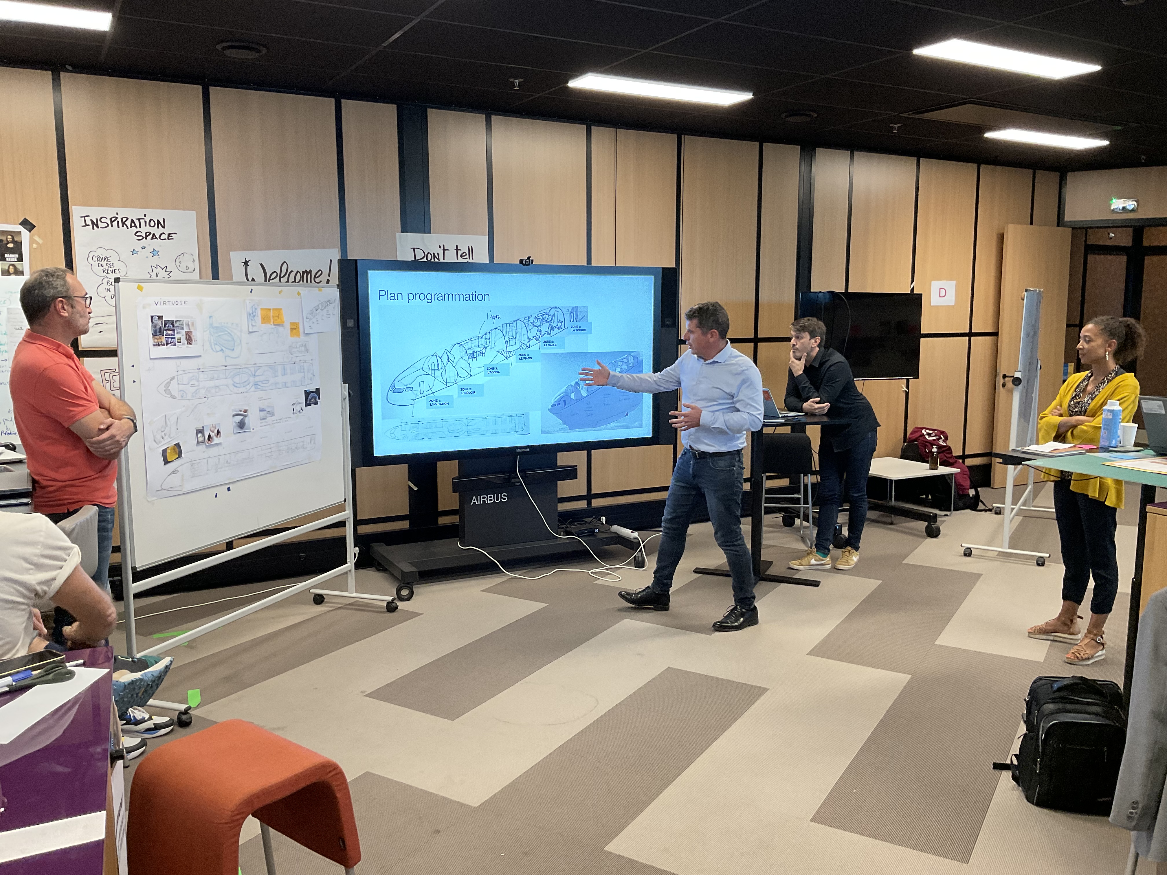 "The way to create the next AJC cabin" est une formation autour des démarches initiales de conception en design, elle s'est déroulée du 11 au 12 octobre 2023 à Blagnac dans le cadre du studio d'innovation Airbus avec quinze membres de l'équipe de Sylvain Mariat - Head of ACJ Design & Concepts - lui même diplômé de l'Ensaama - Olivier de Serres.