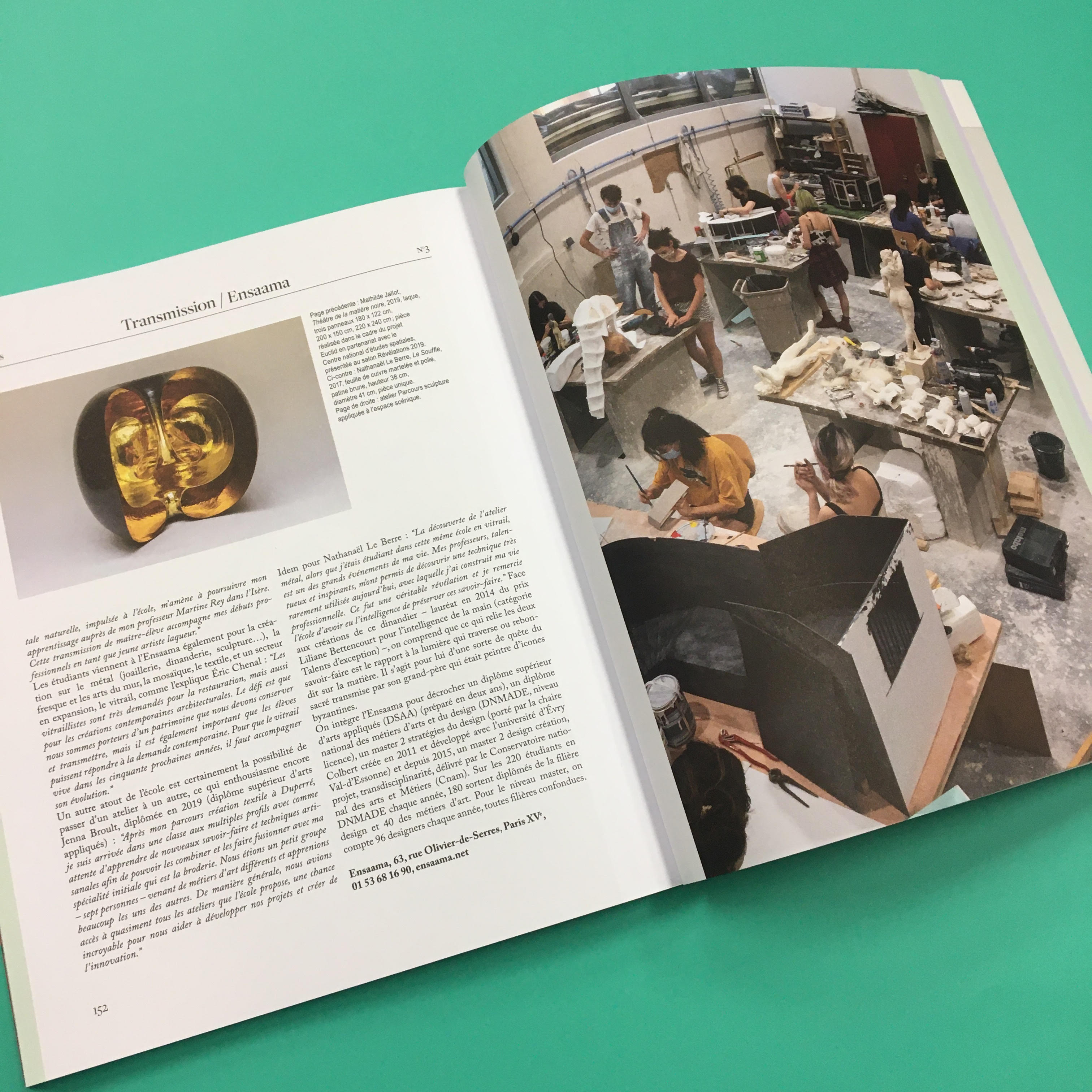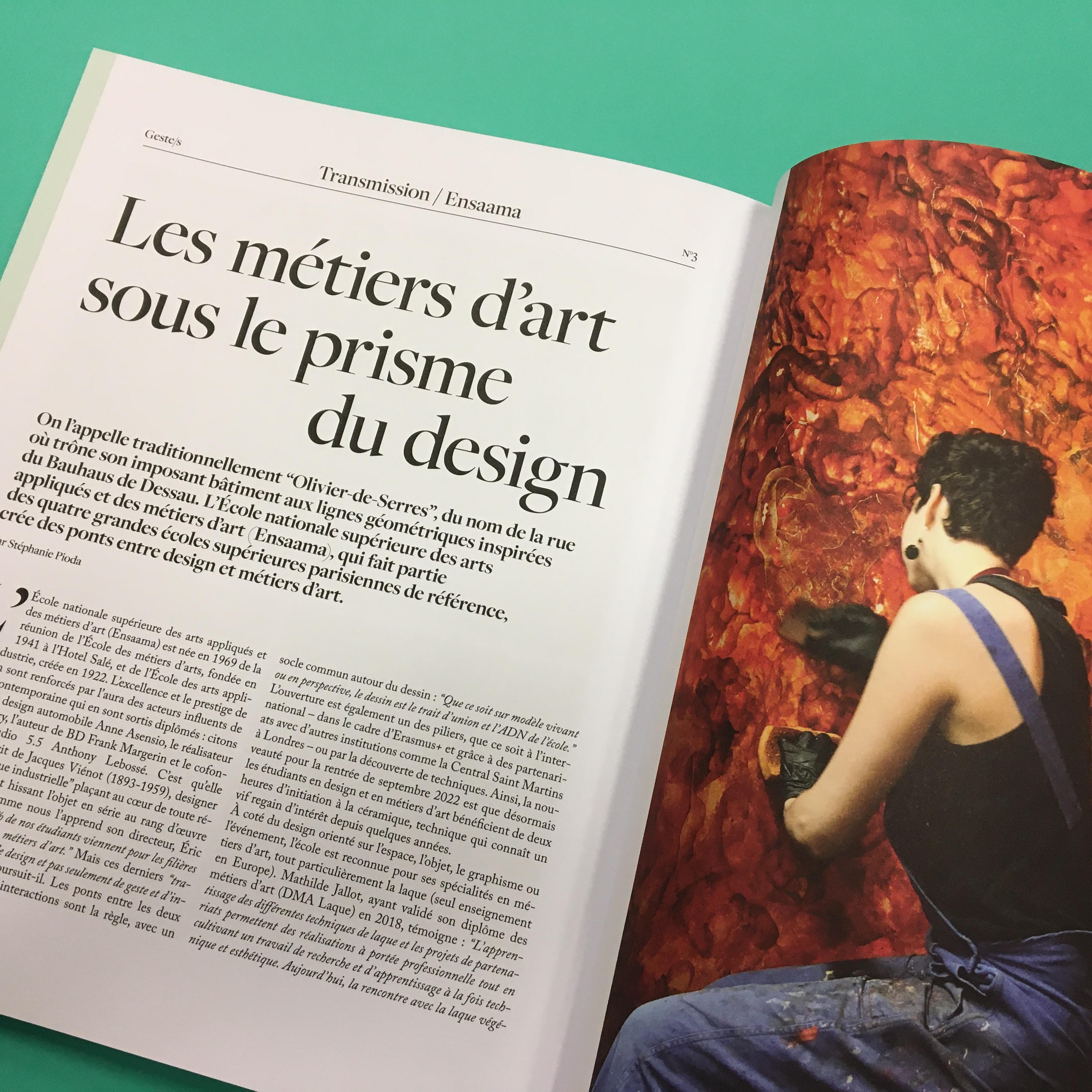 Spécialisé dans les savoir-faire d’excellence et la création contemporaine, le magazine GESTE/S, édité par Beaux-Arts magazine, consacre un bel article à l’ensaama , ses formations et ses spécificités. Les ponts entre l’enseignement du design et des métiers d’art créés dans l’école sont particulièrement mis en valeur.