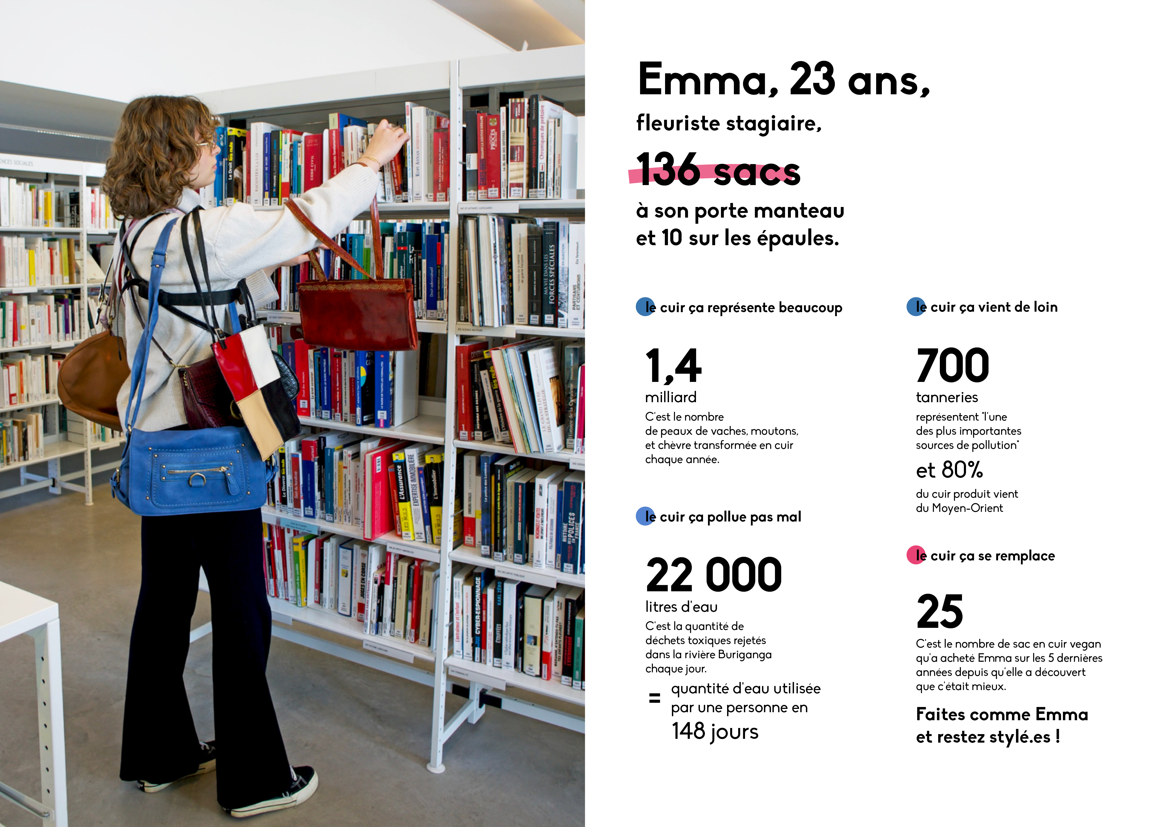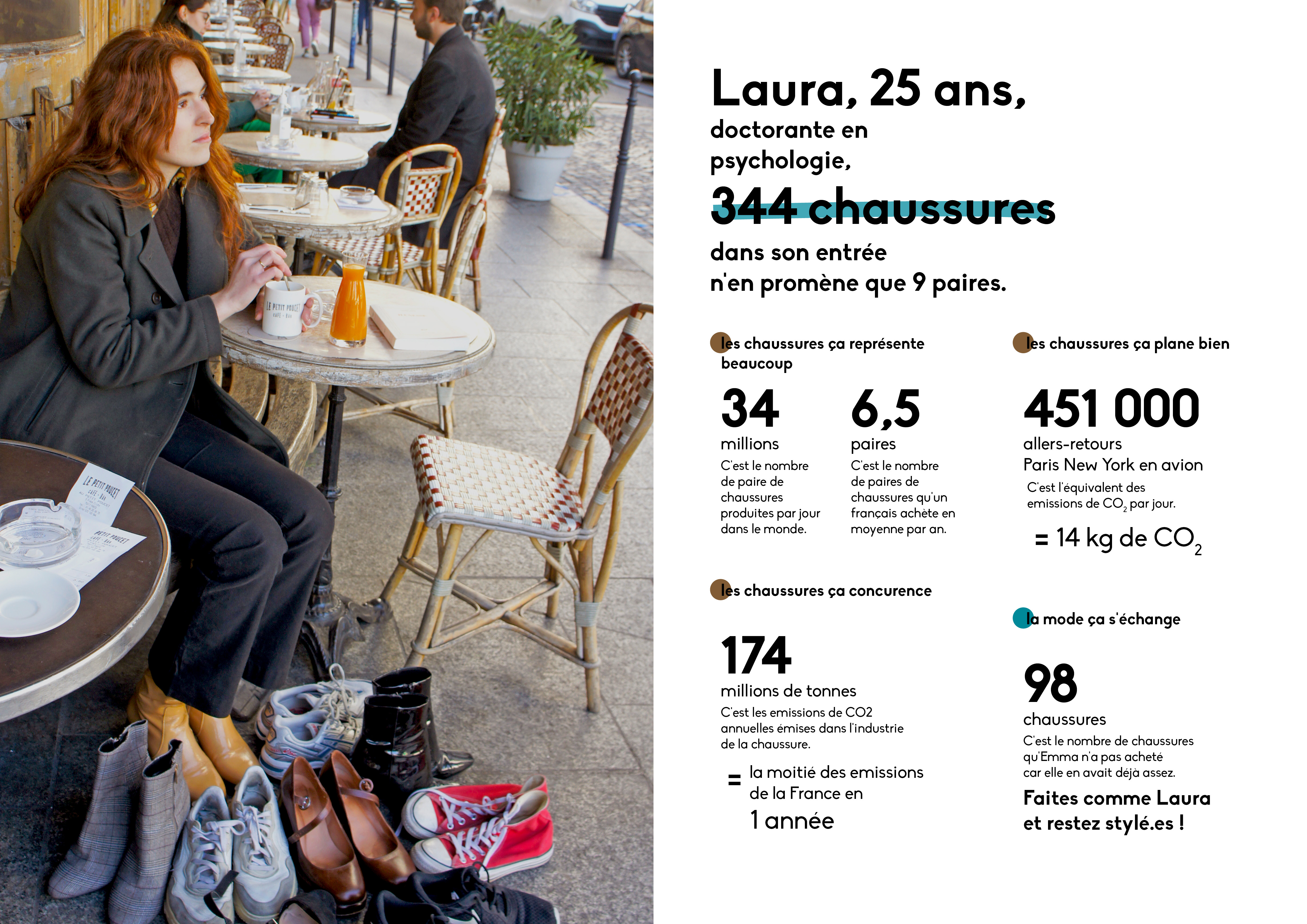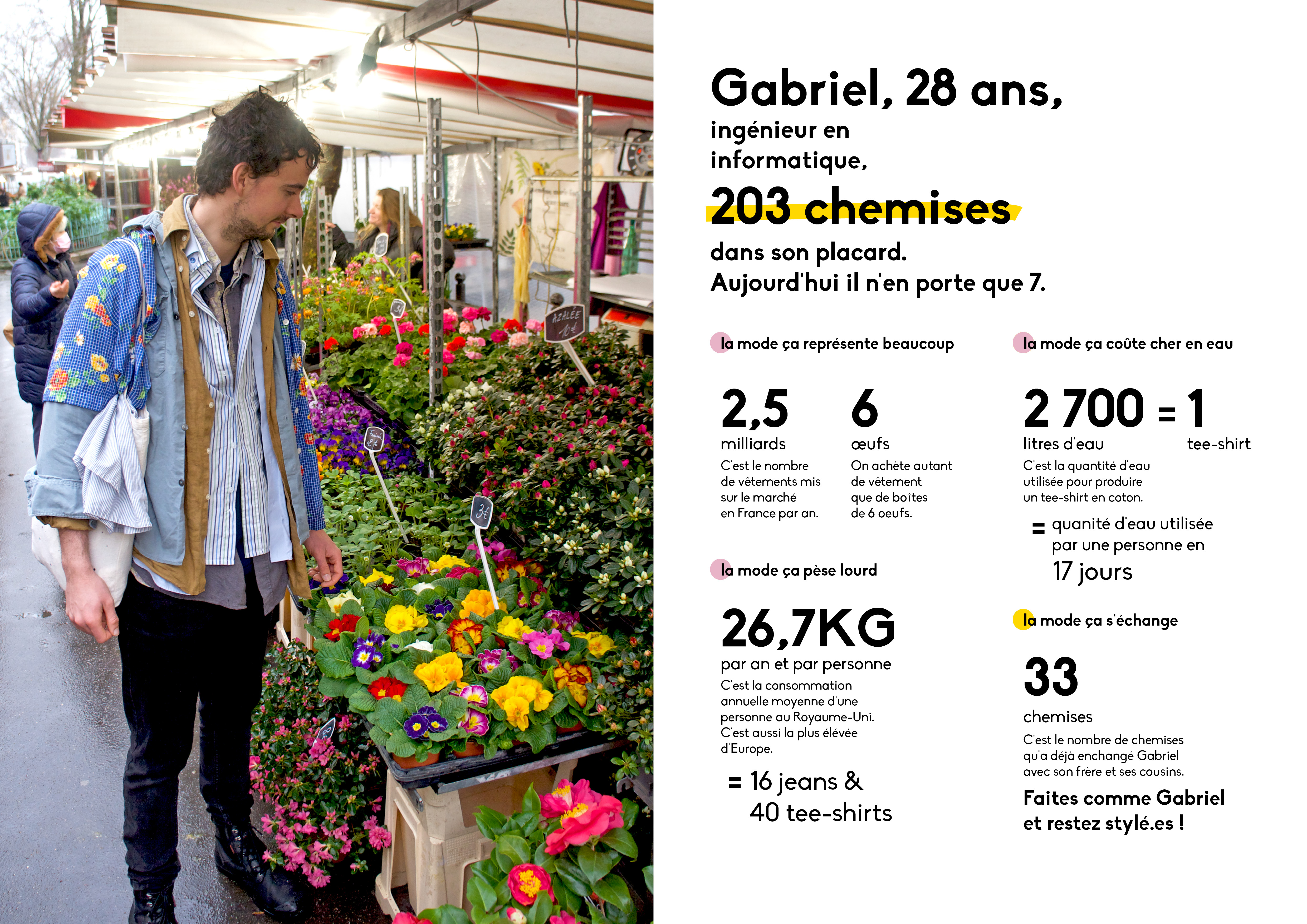 "Nous avons axé notre projet sur le problème de la surconsommation vestimentaire afin de faire prendre conscience aux gens du nombre réel d’habits qu’ils ont dans leurs placards. Pour cela, nous avons réalisé une campagne publicitaire en prenant le parti pris de l’humour et de l’absurde pour ne pas adopter une attitude moralisatrice vis à vis des consommateur.ices. Nos affiches se basent sur une série de photographies mettant en scène des personnes dans des situations du quotidien portant sur elles une accumulation hyperbolique d’un même vêtement dans un but d’identification du/de la client.e. La campagne se déploie dans la rue, les transports ou encore les arrêts de bus mais aussi dans les magazines et sur les réseaux sociaux, l’image s’accompagnant de datas précises et comparatives sur l’industrie du vêtement mis en avant ainsi que des solutions alternatives et éthiques pour y remédier. Pour donner une dimension plus personnelle à la campagne, nous avons inclus une série de témoignages de consommateur.ices nous donnant leurs habitudes d’achats mais aussi ce qu’ils aimeraient améliorer dans leur façon de consommer.