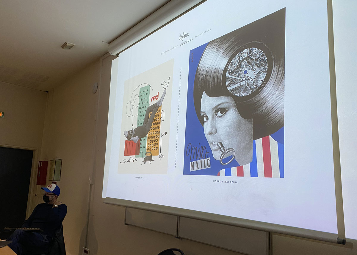 Ce parcours très singulier lui a permis de toucher à de nombreux domaines des métiers du graphisme. A l’occasion de cette conférence-débat les étudiants ont pu comprendre les différents statuts professionnels, le rapport avec le client, la tarification, le rôle du relationnel, et ce afin de mieux saisir la nature de leur future activité.