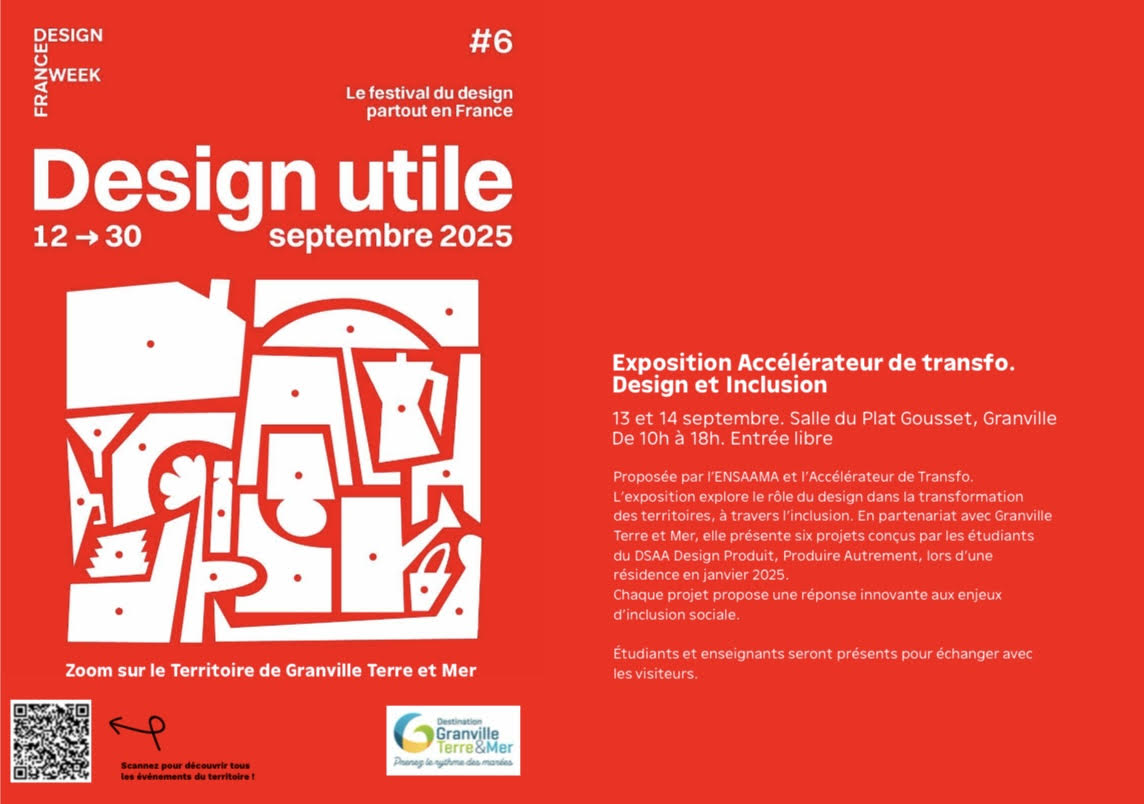 Proposée par l’ENSAAMA et l’Accélérateur de Transfo. L’exposition explore le rôle du design dans la transformation des territoires, à travers l’inclusion. En partenariat avec Granville Terre et Mer, elle présente six projets conçus par les étudiants du DSAA Design Produit, Produire autrement, lors d’une résidence en janvier 2025. Chaque projet propose une réponse innovante aux enjeux d’inclusion sociale.