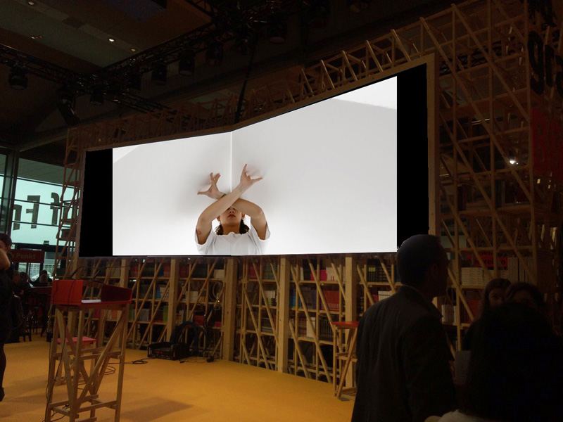 Une contrainte créative, destinée à faire écho à l’identité graphique conçue par le graphiste Ruedi Baur pour la foire de Francfort, était proposée aux étudiants : Respecter l’axe médian de l’écran. La forme est ainsi liée au pli central du livre et permet une dialectique de la double-page sur laquelle photos, typographies, dessins, images donnent une interprétation du plaisir de lire. Les modules vidéos, muets, animent les écrans disposés dans le pavillon français, au cœur des bibliothèques.
