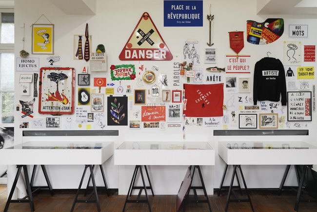 Les étudiants ont pu découvrir son parcours de designer graphique, à travers la présentation des différentes facettes de sa production : affiches, papillons et tracts militants, installations in situ revisitant des productions antérieures, publications et éditions diverses, pour finir par un espace atelier à l'étage et une discussion centrée sur la profession de graphiste.
