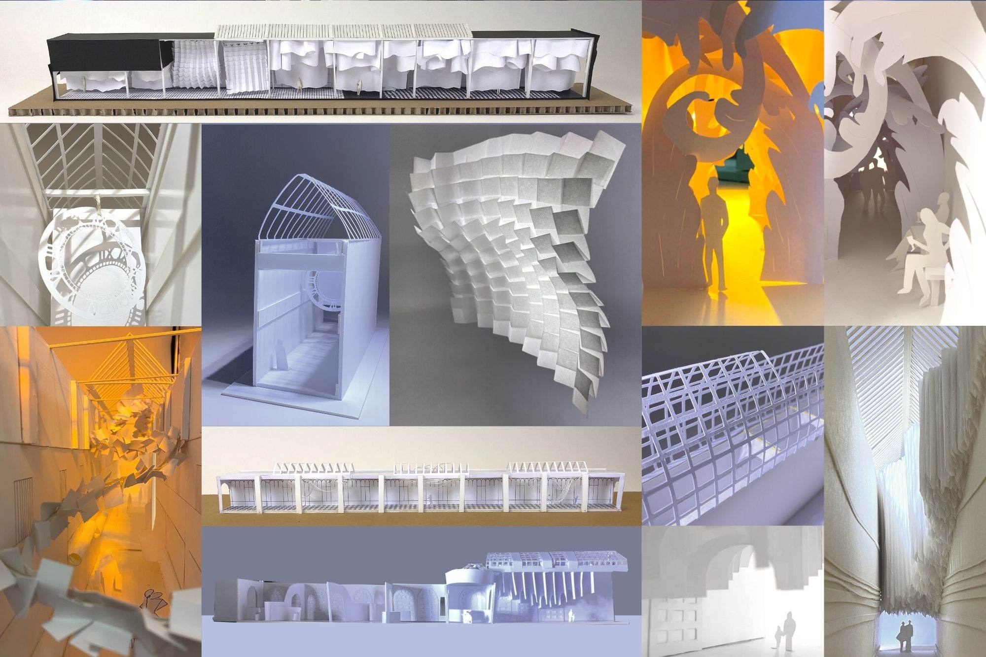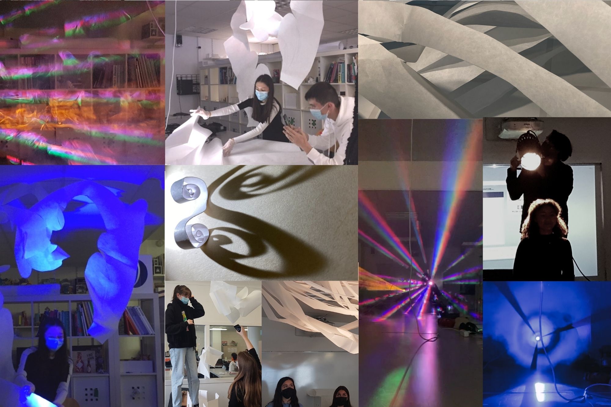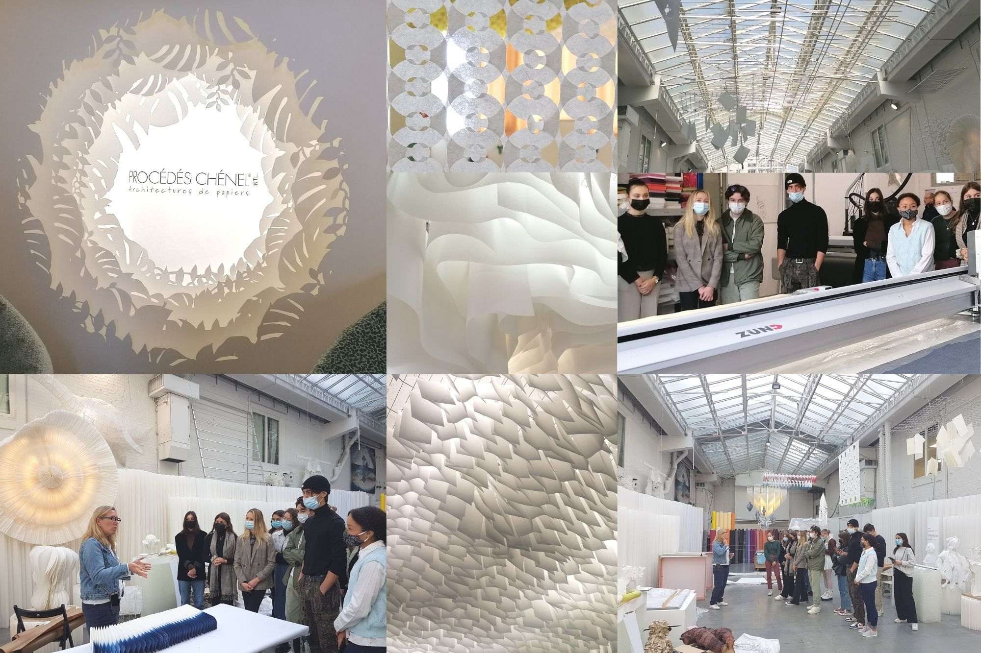 Après la visite du showroom et la présentation des ateliers des Procédés Chénel, puis l'intervention et la sensibilisation au rôle de la lumière par Gauthier Haziza, les étudiants des deux parcours confondus ont imaginé sous forme de recherches et d’expérimentations plastiques, graphiques et volumiques, par groupe de quatre, une structure éphémère en papier qui souligne l’architecture d’un passage parisien.