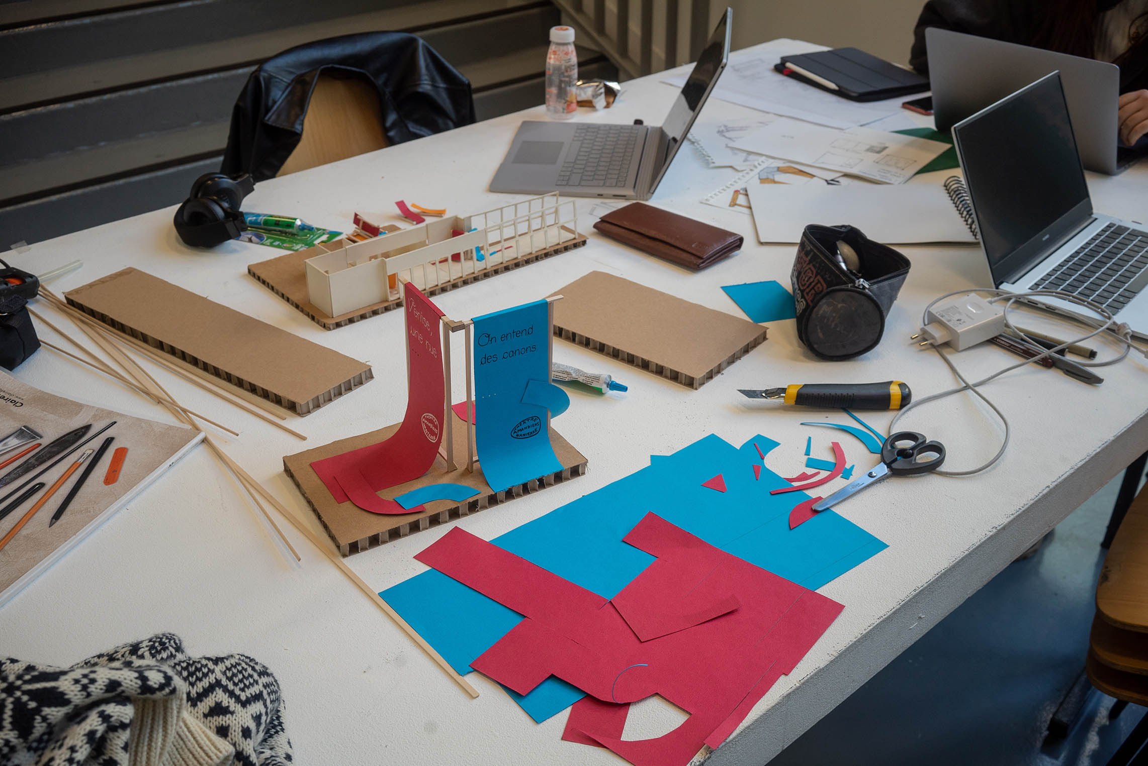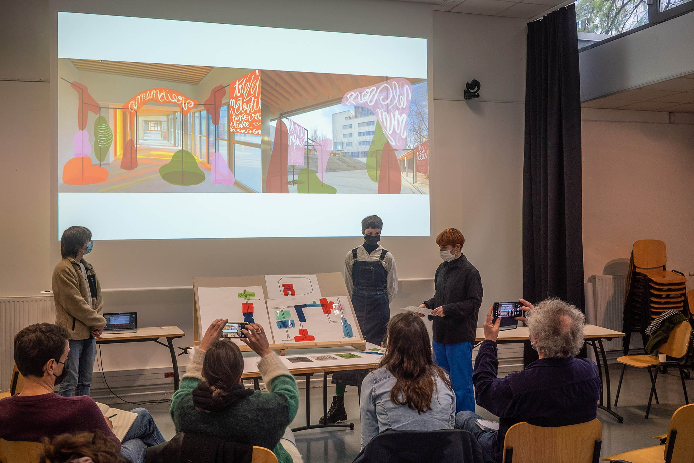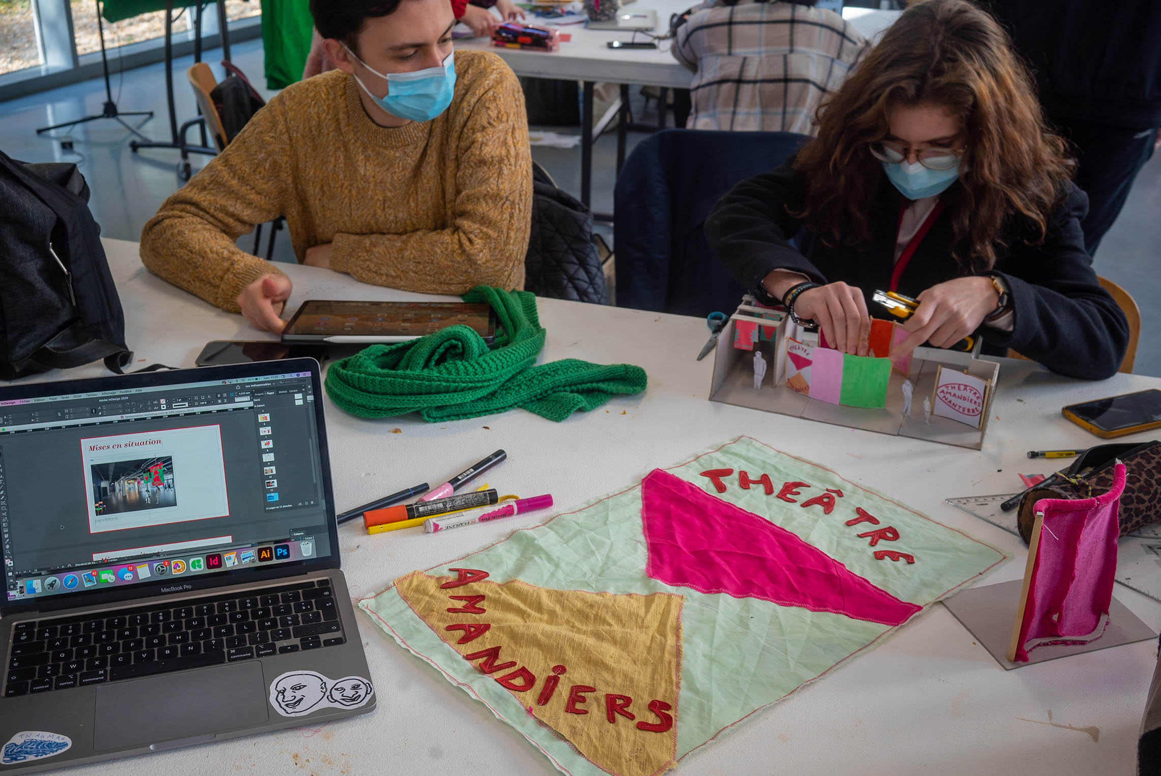 Les étudiants de deuxième année DNMADE Espace « Patrimoine et lieux culturels » et Graphisme « Édition – typographie » devaient concevoir un dispositif spatial et graphique permettant d’identifier le théâtre Nanterre-Amandiers lorsqu’il se produit hors les murs.