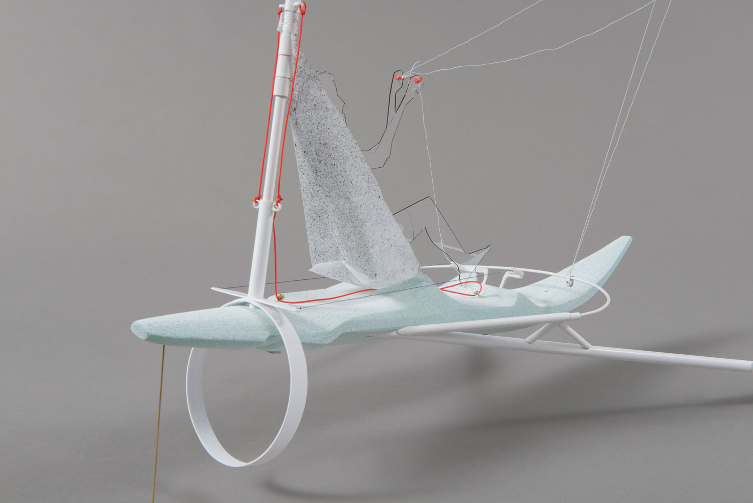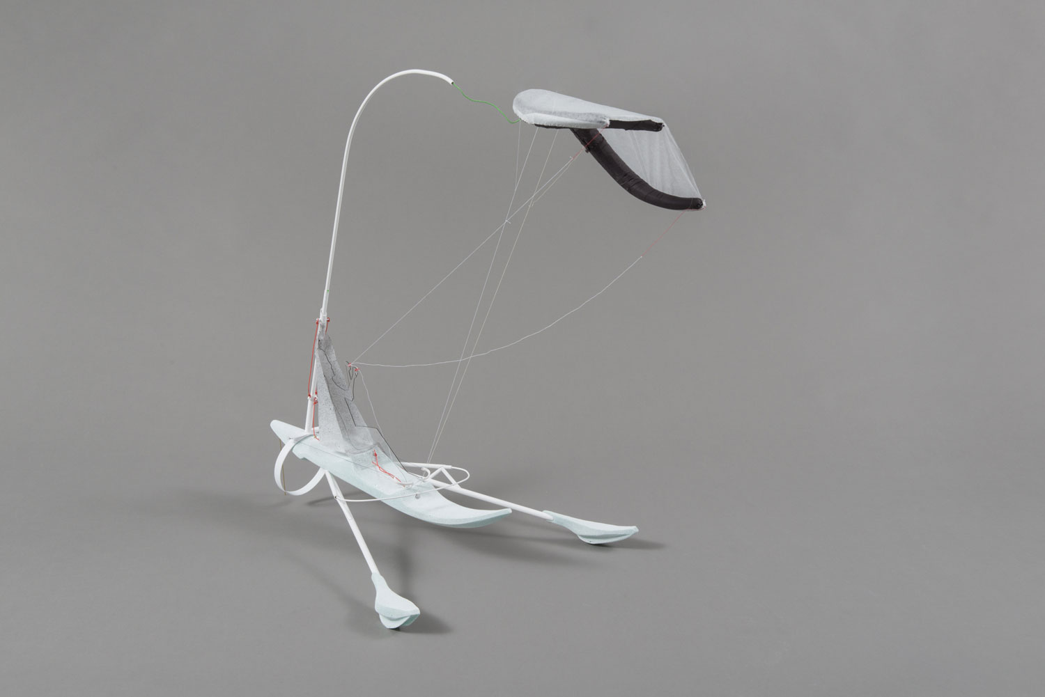 L’étude la relation entre les Hommes et l'environnement aquatique couplé à mes expériences et mes tests de prototypes, m’ont permis de dégager une problématique importante des sports d’eau. Comment faire ressentir le plus intuitivement possible les diverses sensations que le milieux nautique peut proposer aux jeunes débutants et aux plus expérimentés? Je propose ici une embarcation qui décuple les sensation et modernise la vision du nautisme. Il s’agit d’une embarcation où l’enfant se trouve allongé sur le ventre regard direct sur l’eau avec un guidon-gouvernail en main. La particularité de cet objet est qu’il est pourvu d’un foil, destiné à le soulever dès qu’il atteint une vitesse de 8km/h. L’enfant se sent alors comme voler tout près et au dessus l’eau et en oubli pratiquement son support planant. Le support est évolutif, il suit donc la progression du pratiquant. La commande de la voile est ramenée devant grâce à une poulie et un poids stabilise le support.