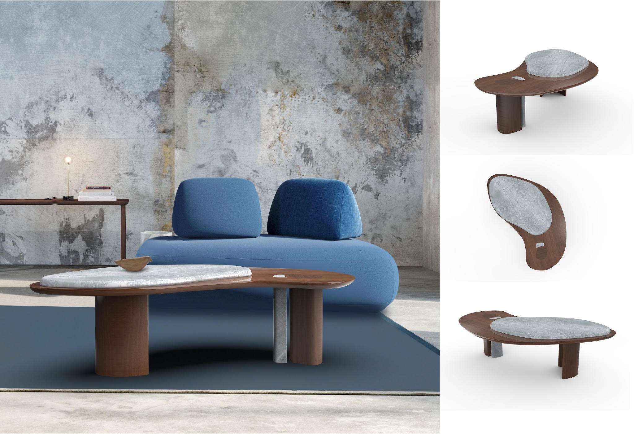 Durare est une table basse vecteur de convivialité située au cœur de l’habitat. Ses courbes chaleureuses sont évocatrices de savoir-faire et de modernité. Sa forme enveloppe les usagers afin de favoriser un contact propice à l’échange et au partage. Son esthétique fait dialoguer des matières contrastées, elle allie un bois sombre et imposant avec une pierre claire et finement taillée.