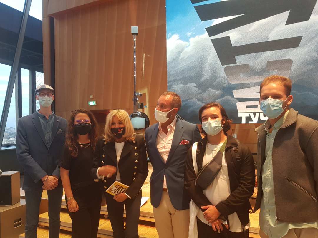 Les étudiants de l'Ensaama, lauréats du concours inter-écoles pour le mobilier de l'Élysée, entourant L. Scordino-Mazanec à la Tour Eiffel.