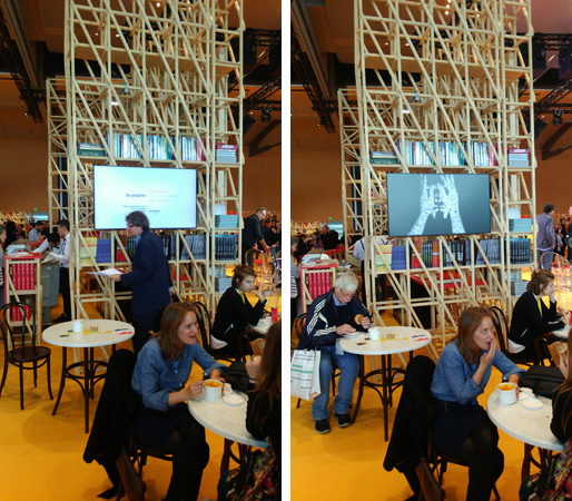 Une contrainte créative, destinée à faire écho à l’identité graphique conçue par le graphiste Ruedi Baur pour la foire de Francfort, était proposée aux étudiants : Respecter l’axe médian de l’écran. La forme est ainsi liée au pli central du livre et permet une dialectique de la double-page sur laquelle photos, typographies, dessins, images donnent une interprétation du plaisir de lire. Les modules vidéos, muets, animent les écrans disposés dans le pavillon français, au cœur des bibliothèques.