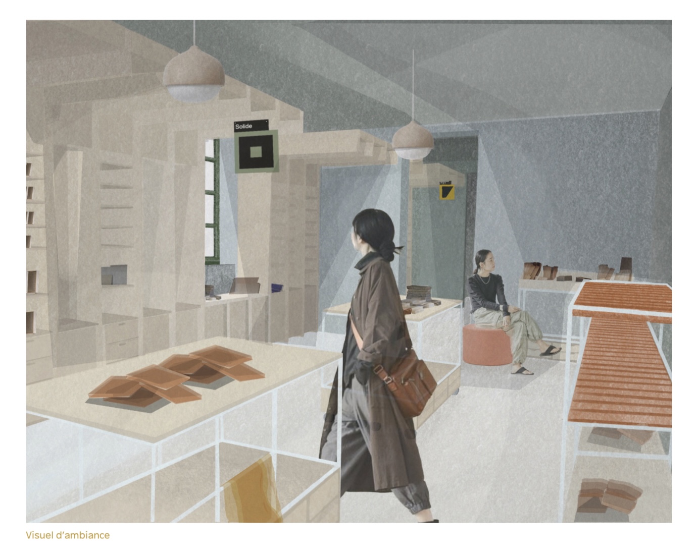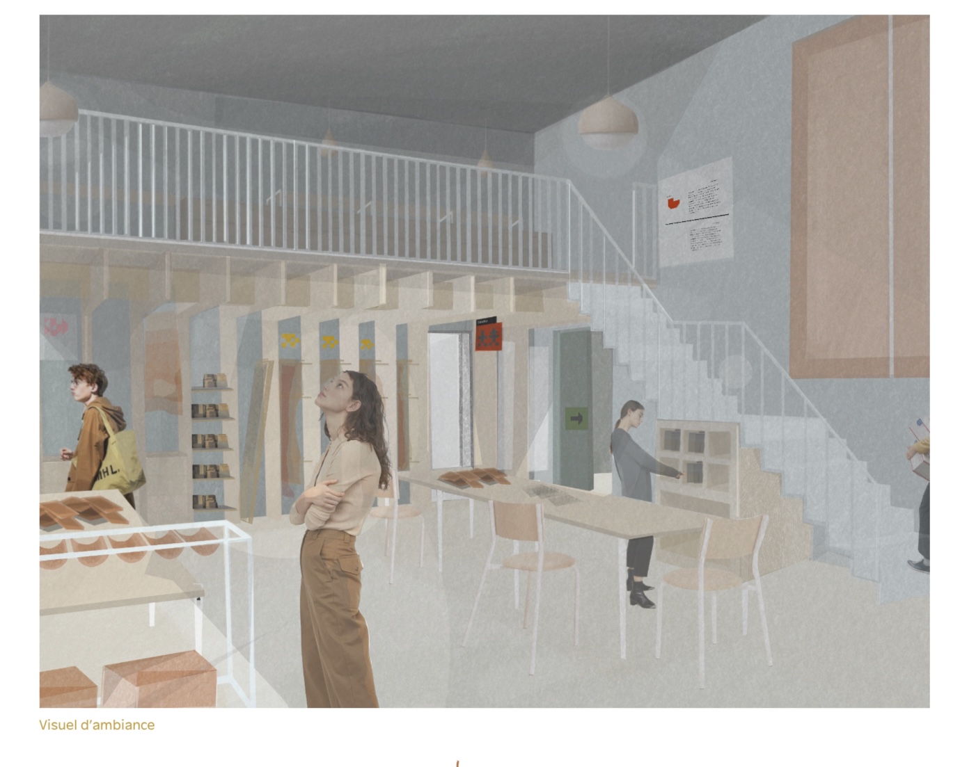 les étudiants de Dnmade Habitat étaient associés au étudiants de graphisme du lycée Auguste Renoir afin d'imaginer les espaces, les usages, le mobilier et les éléments de communication et de charte graphique de la Matériauthèque.