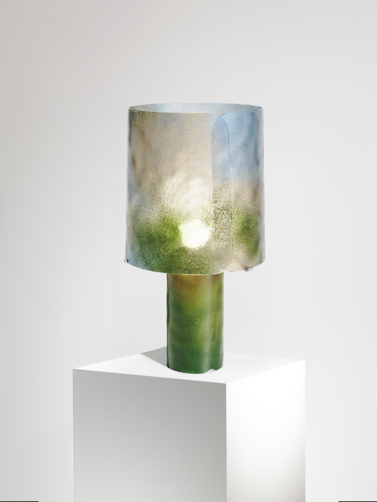 La lampe Horizon, en acier inoxydable émaillé transparent et émail céramique, est le fruit d’une recherche autour de l’émaillage des métaux.