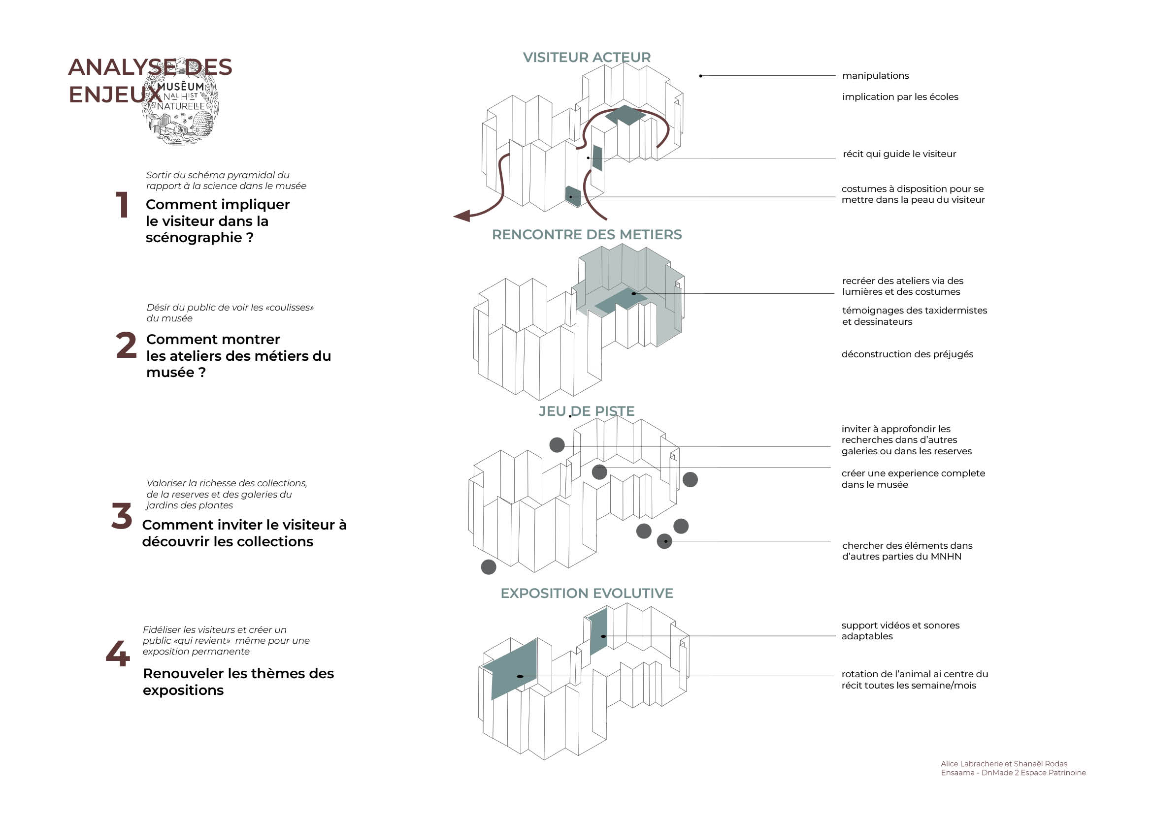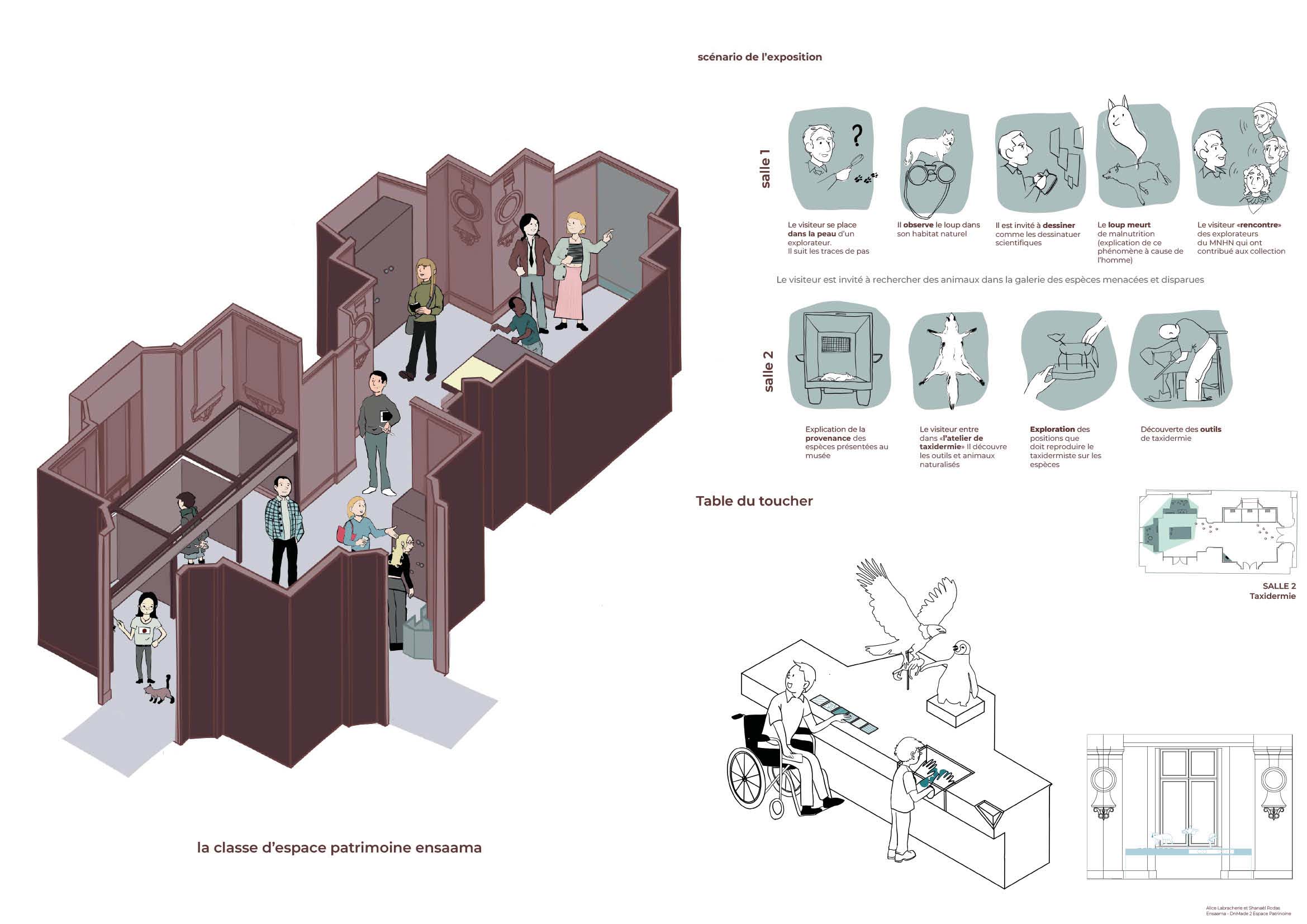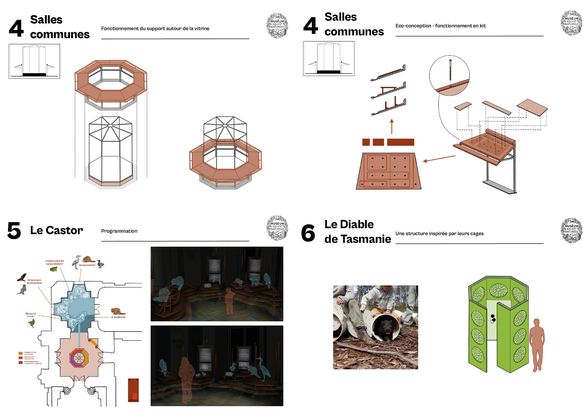 Dans le cadre d’un partenariat avec le MNHN, les étudiants de DNMADE 2 « Patrimoine et lieux culturels » devaient concevoir deux espaces scénographiques ayant vocation à s’intégrer au parcours de visite actuel, plus particulièrement à l’Acte III « L’Homme facteur d’évolution ».