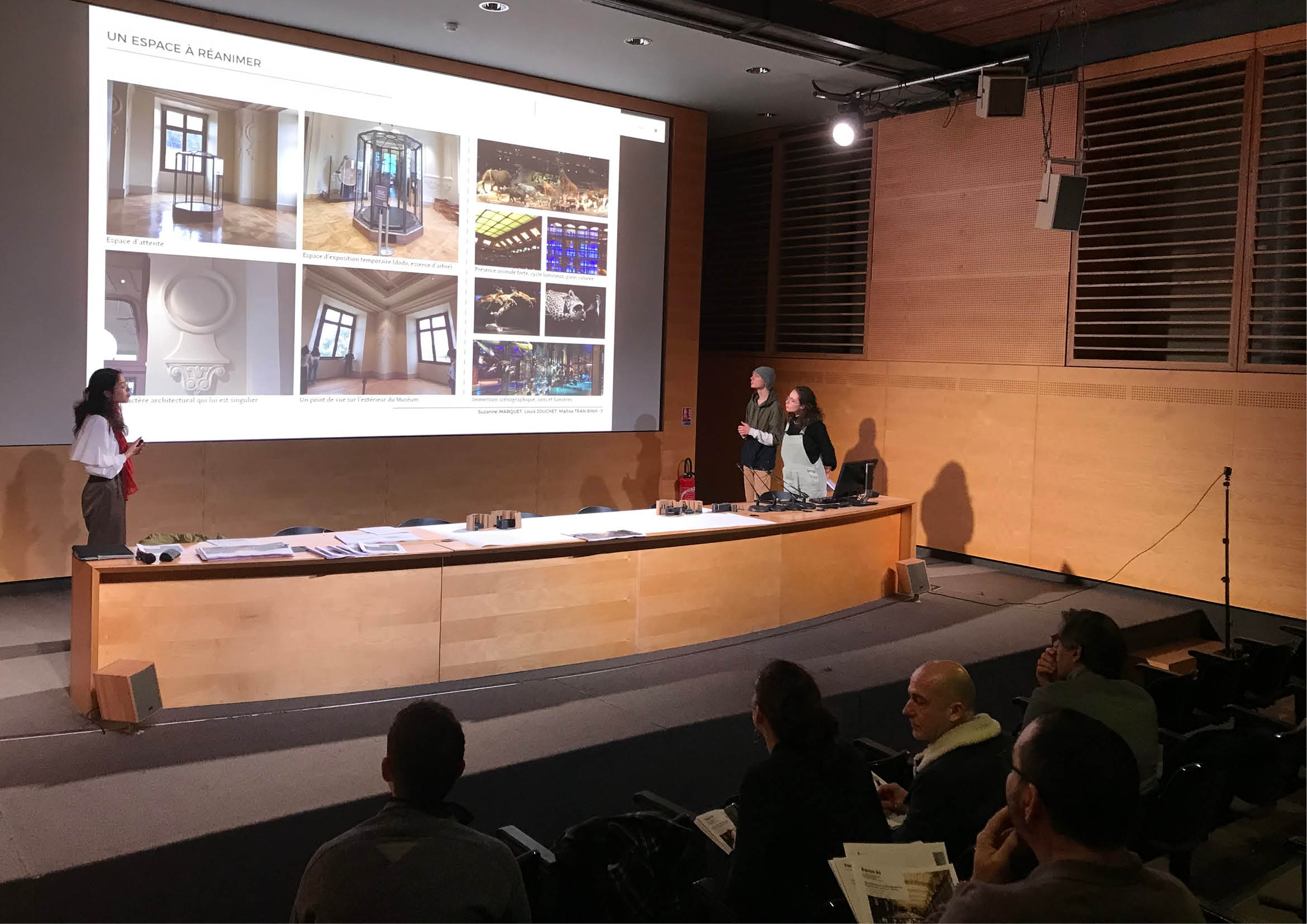 La restitution des projets élaborés par les étudiants de Dnmade Espace « Patrimoine et lieux culturels » s’est déroulée à l’auditorium de la Grande Galerie de l’Évolution. Chaque équipe a eu l’occasion d’exposer de manière détaillée sa scénographie puis d’échanger avec le jury. Ces soutenances concluaient de belle manière la collaboration avec le MNHN débutée au mois d’octobre.